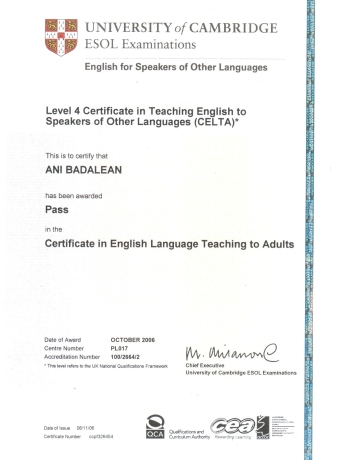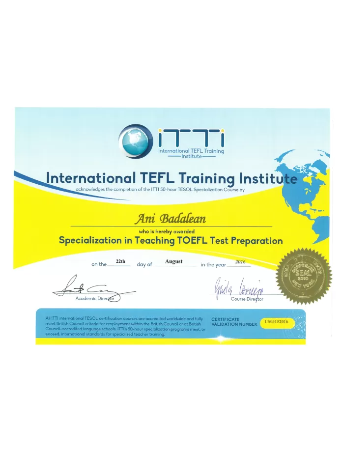 Certificat în predarea pregătirii pentru testul TOEFL de la International TEFL Training Institute din New York